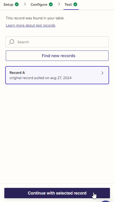 Click Test trigger to see if Zapier can find our sample record. Once the test is successful, click Continue with selected record: