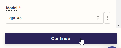 Select the Model you want to use, such as gpt-4o. You can keep the other settings as they are or adjust them as needed. Once you're finished, click Continue: