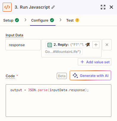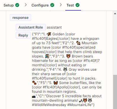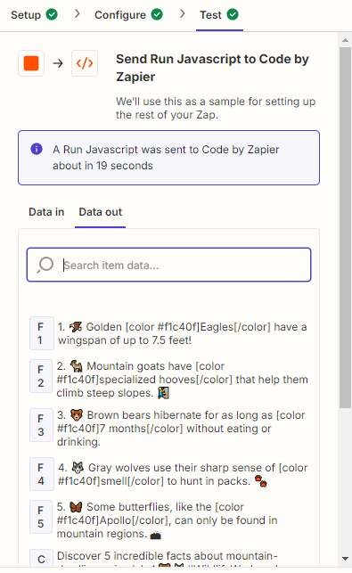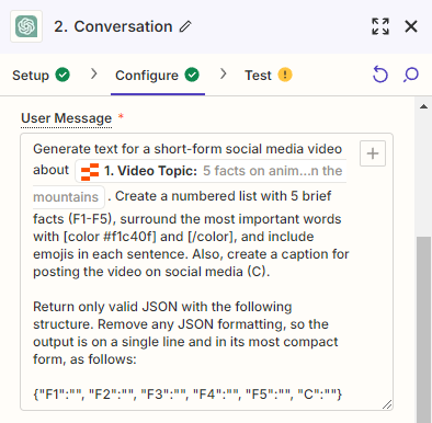 The response from ChatGPT is exactly what we asked for — a JSON object with 5 facts and a social media caption. However, Zapier can't interpret this format directly, so we'll need to convert it before generating the videos. That's what we'll do next.