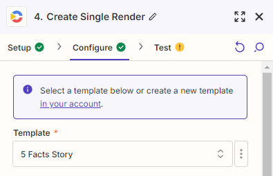 Add the Creatomate app with the Create Single Render action event. Then, select your account or signing in with your project's API key, which you can find under Project Settings in your Creatomate dashboard.
