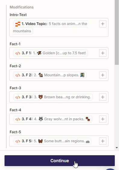 To illustrate, we will generate videos based on a single input prompt: "5 facts on animals that live in the mountains". We'll use ChatGPT to generate the text captions, which will then be used to create a unique video, ready to be posted on social media. Completely automated!