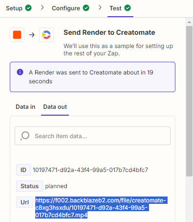 You can view the video by visiting the URL provided in the test result. The video generation may take a few seconds, so if you see a 'Not Found' message, wait a moment and refresh the page. This only happens during Zap setup. Once the workflow is active, it will wait for the video to finish before proceeding to the next step.