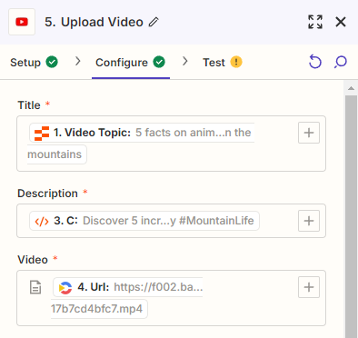 Next, click on Test step. This will only verify that Zapier is passing the correct data, so the video won't be uploaded to your YouTube channel.