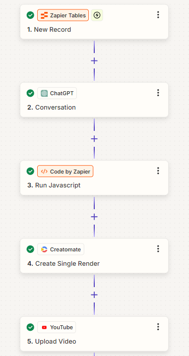 After that, we'll set up the automation in Zapier. To keep things simple, I'll demonstrate how to use a Zapier Table to input a video topic into the workflow. In real-world applications, you can use any app that suits your needs, like Airtable or Google Sheets. ChatGPT will then generate video content and a social media caption based on the topic. We'll parse this response to connect it to our video template in Creatomate, allowing it to produce a video. Once the video is ready, we can share it on social media. I'll show you how to upload it as a YouTube Short, but you can also share it on TikTok or Instagram — it's up to you.